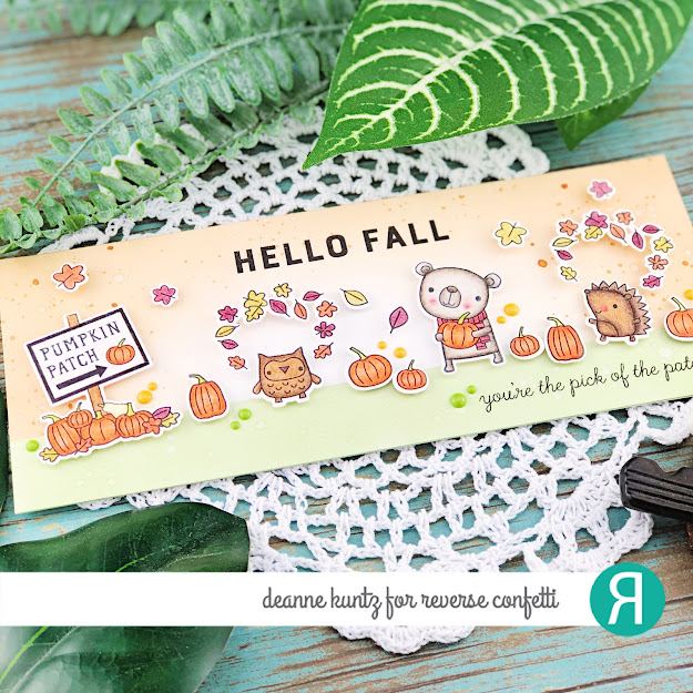 I started my slim line card by inking some soft Fall colours for the back ground. I then coloured and adhered LOTS of pumpkins, leaves and fun little character from Pick of the Patch (with the coordinating Confetti Cuts).